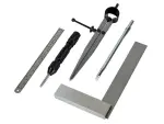 Faithfull 5-piece stainless steel marking & measuring set for precise metalwork. Includes divider, rule, carbide scribe, punch & square.