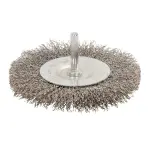 High-tensile stainless steel wire wheel brush for rust removal, deburring & surface prep. 100mm, 6mm shank, max 4500 RPM.