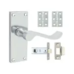 Complete set for latching internal doors: Victorian scroll handles, 64mm latch & 76mm hinges in polished chrome finish. Screws included.