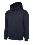Comfortable Uneek unisex hooded sweatshirt in navy - 50% polyester, 50% cotton blend with double hood & pouch pocket.