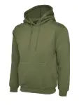 Premium 50/50 cotton-poly hoodie from Uneek. Features double hood, pouch pocket & Lycra cuffs. Olive colour. Size 6XL.