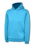 Soft, vibrant kids' hooded sweatshirt (5/6Y) by Uneek. Made from 50% polyester/cotton, with a pouch pocket and double hood.