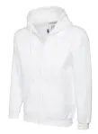 Comfortable unisex full-zip hooded sweatshirt from Uneek. 50% polyester/50% cotton with brushed interior. White, Size S.