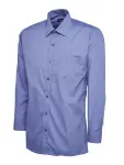 Stylish Uneek men's poplin long sleeve shirt in mid blue. Durable 65% polyester & 35% cotton blend with stiff collar & adjustable cuffs.