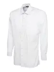 Stylish Uneek men's poplin long sleeve shirt in white. 65% polyester, 35% cotton - perfect for office or formal wear.