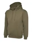 Premium 50% Polyester 50% Cotton hooded sweatshirt by Uneek with a brushed finish, olive colour, and durable stitching.