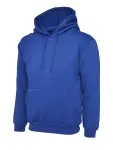 Comfortable unisex hooded sweatshirt with full zip, pouch pocket & Lycra cuffs. 50% cotton, 50% polyester, red, size XL.