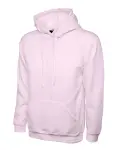 Comfortable unisex hooded sweatshirt with full zip, pouch pocket & Lycra cuffs. 50% cotton, 50% polyester, red, size XL.